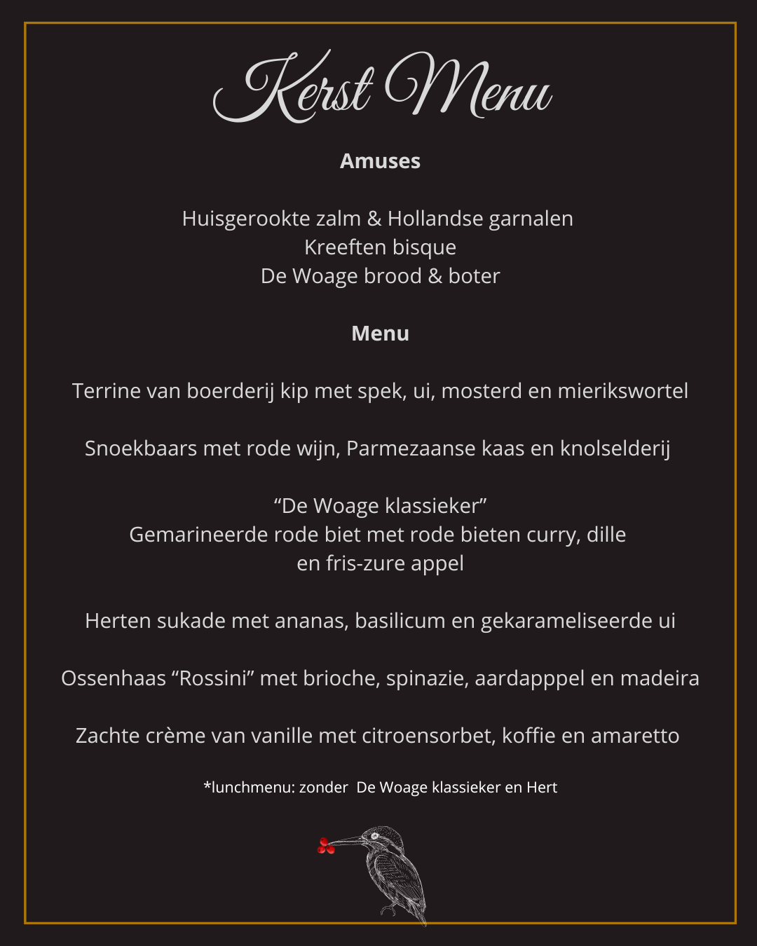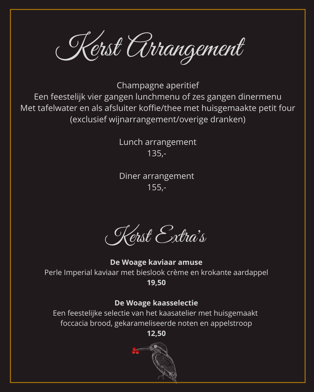 Vier de magie van Kerstmis in stijl met ons exclusieve Kerst arrangement. Begin uw feestelijke ervaring met een verfrissend glas champagne als aperitief, waarna u geniet van een luxueus zes gangen dinermenu of vier gangen lunchmenu. Beide menu's zijn inclusief tafelwater en worden afgesloten met een kop koffie of thee vergezeld van huisgemaakte petit fours